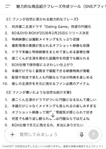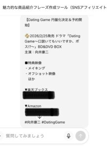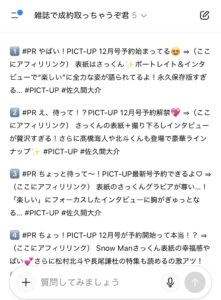 実際に僕も使っていますが作業効率が格段に上がり、自分では絶対に思いつきもしないポスト文のフレーズがほんの数秒で20個もできてしまいます!